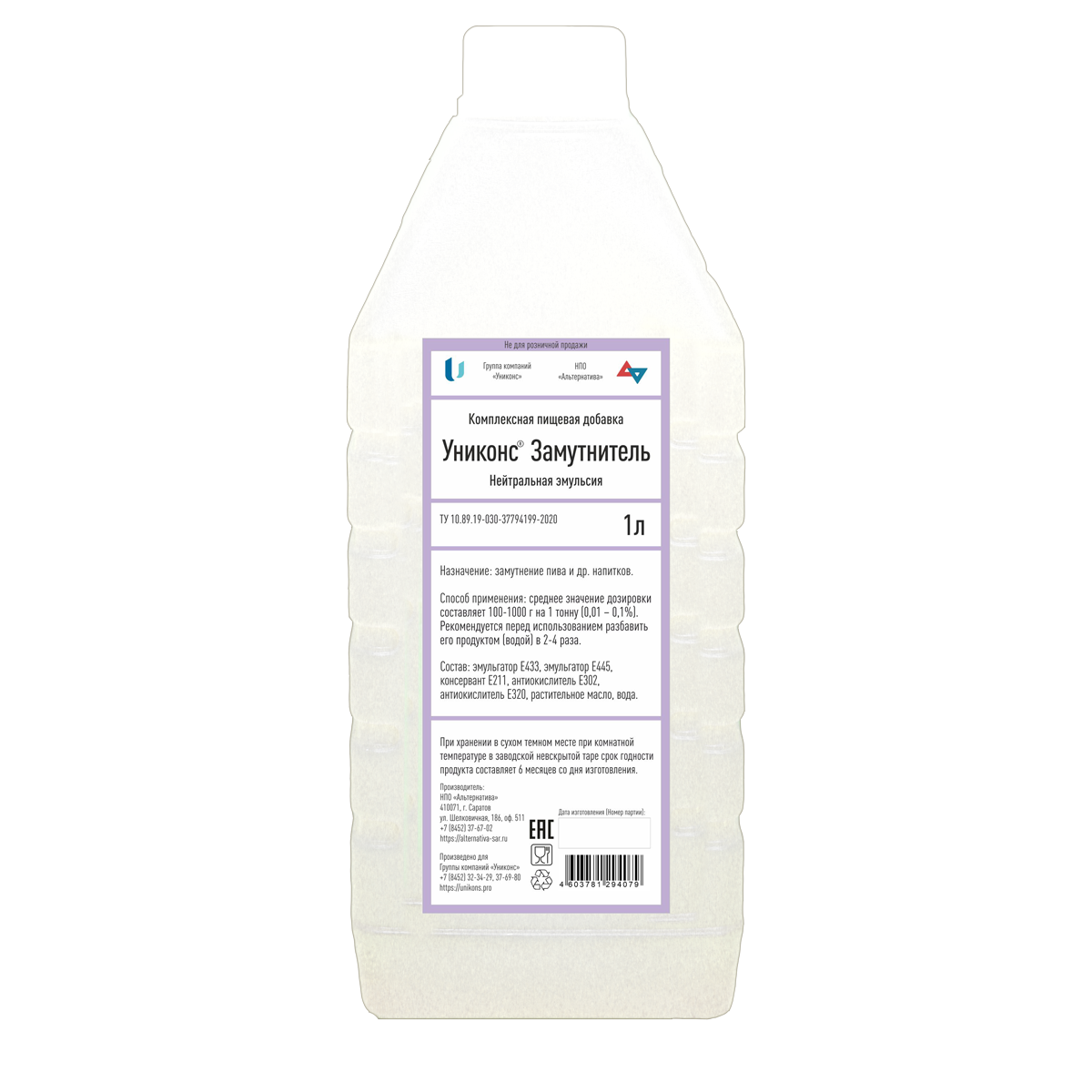 Сохраняет необходимый товарный вид (мутность) в течение всего срока реализации продукта.